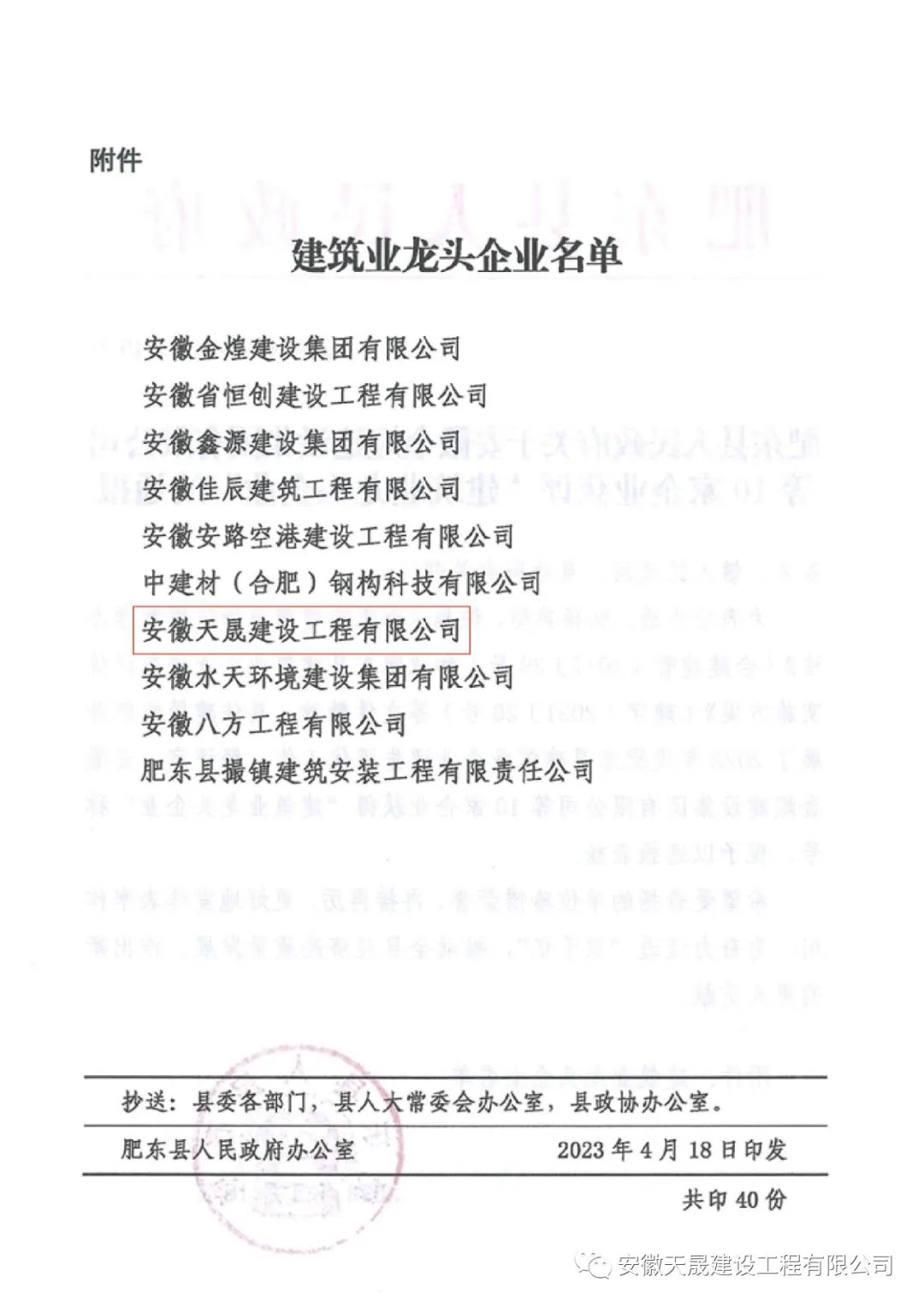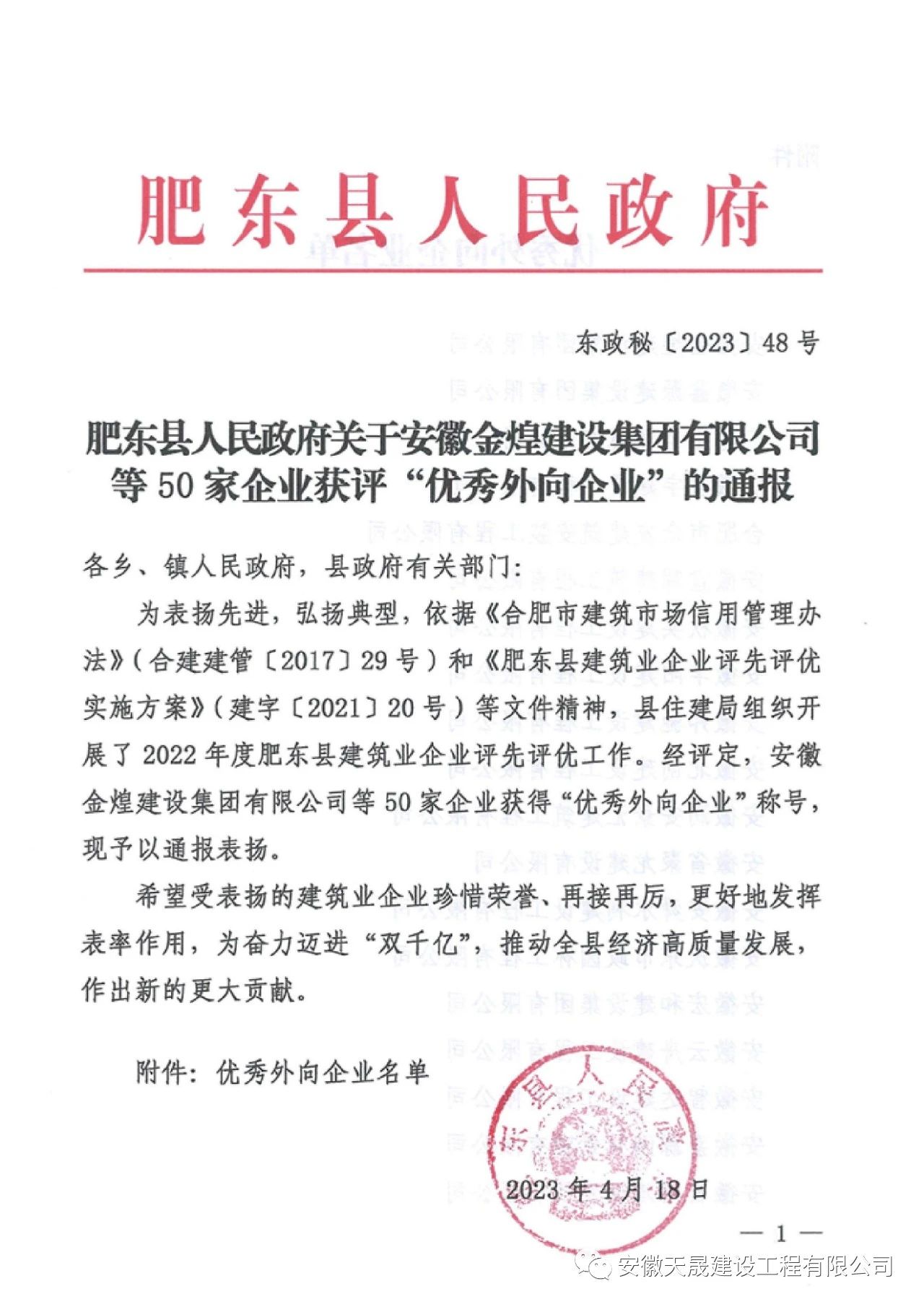 安徽天晟建設在2022 年度肥東縣建筑業企業評先評優工作中榮獲“建筑業龍頭企業”榮譽稱號和“優秀外向企業”榮譽稱號!
